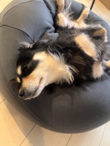 ビーズクッションの上でお腹出して爆睡🐶💤